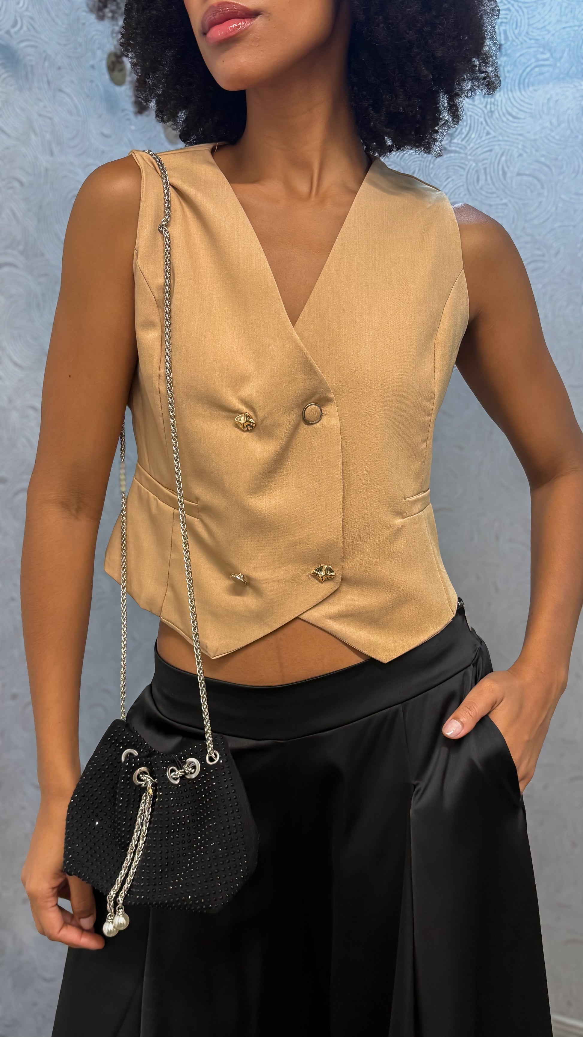 Chaleco estructurado de corte elegante, ideal para elevar cualquier look con un toque moderno y sofisticado. Su diseño sin mangas y botones decorativos aportan un aire refinado y versátil, perfecto para combinar con faldas, pantalones o jeans. Una prenda clave que equilibra estilo y distinción en cada ocasión.